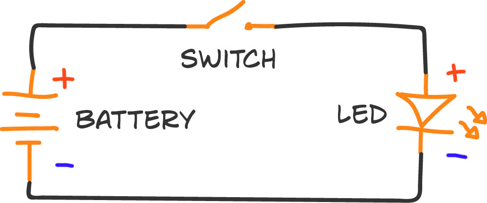 Here's what our circuit looks like when we've added the battery, switch and LED: