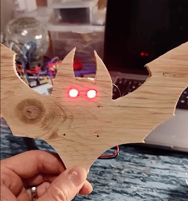 "When I think Halloween, I think BATS!!! This was a short hacking together of bat-shaped plywood and the Ohmify Blinking LED board. I think the back looks scarier than the front due to my Frankenstein Capacitor soldering 😄"