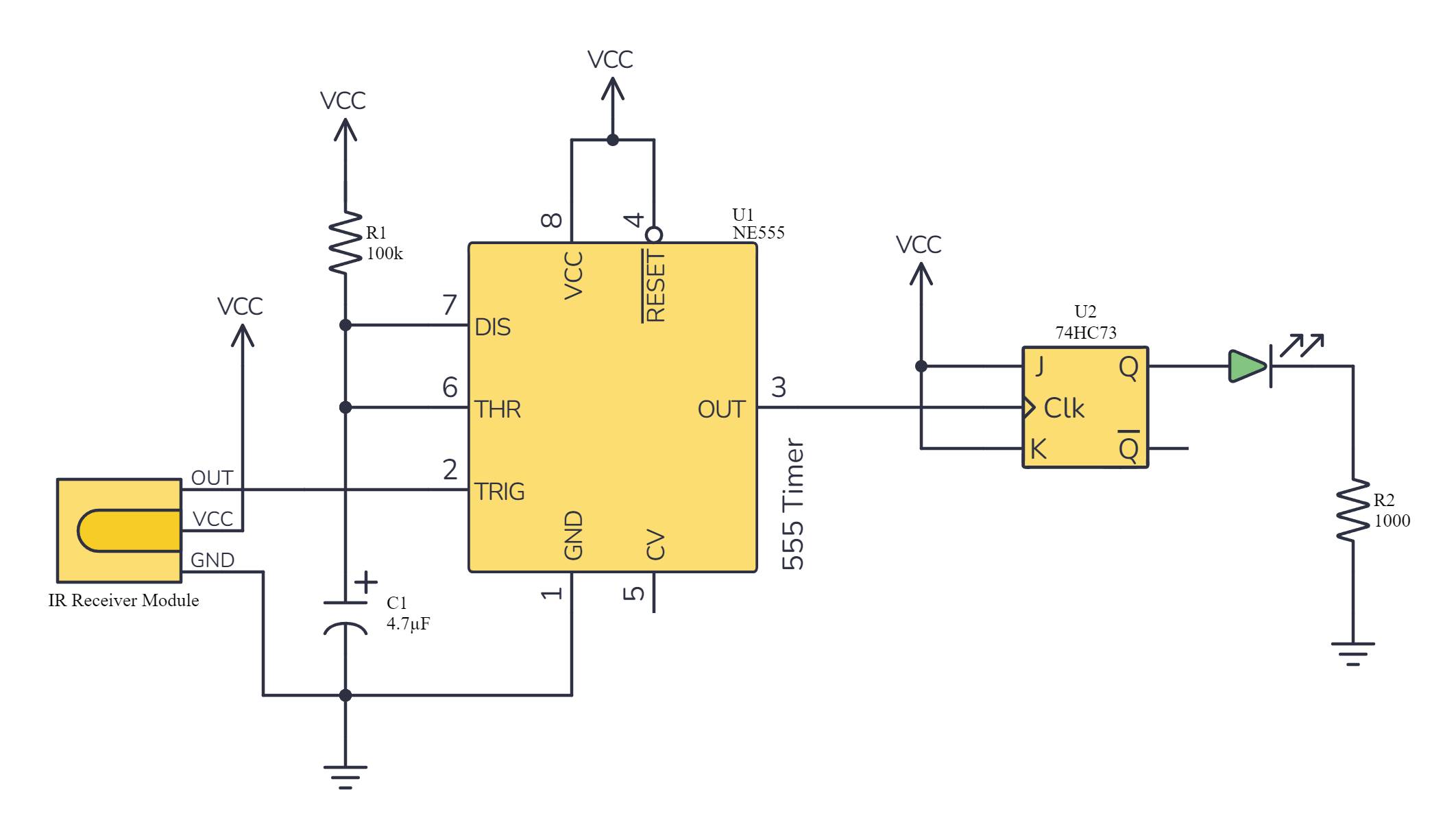 The only change from last time is that I added a JK flip flop on the output. If both the J and the K inputs of a JK flip flop are high when the clock pulse comes, it toggles its output.